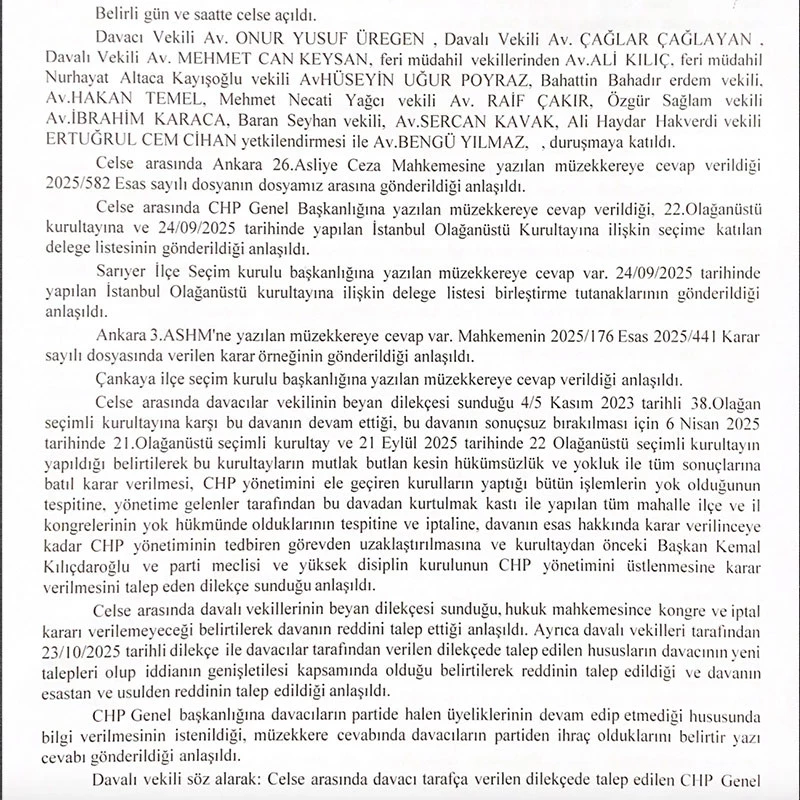 CHP’nin 4-5 Kasım 2023’te yapılan 38’inci Olağan Kurultayı ile 6 Nisan 2025’teki 21’inci Olağanüstü Kurultayı’nın iptali istemiyle açılan davanın beşinci duruşması, Ankara 42. Asliye Hukuk Mahkemesi’nde başladı. Duruşma yoğun katılım nedeniyle Dışkapı Adliyesi’ndeki Z-10 numaralı salonunda yapıldı.