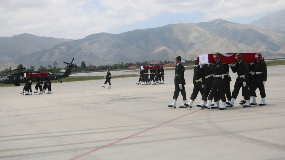 Metan gazına maruz kalarak şehit olan 6 asker, Hakkari’nin Yüksekova ilçesindeki Selahattin Eyyubi Havalimanı’nda düzenlenen törenle memleketlerine uğurlandı.